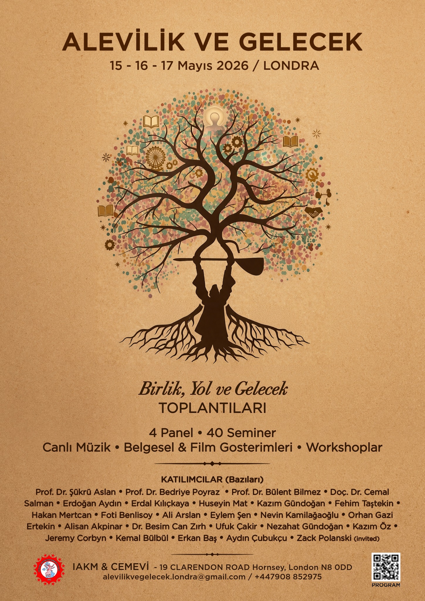 “Yol bir, sürek binbir” şiarıyla düzenlenen Alevilik ve Gelecek: Birlik, Yol ve Gelecek Toplantıları, 15–16–17 Mayıs 2026 tarihlerinde Londra’da, İAKM & Cemevi ev sahipliğinde gerçekleştirilmektedir. Etkinlik, Alevi yolunun kadim bilgeliğini, bugünün sorumluluklarını ve geleceğe ilişkin ortak arayışları birlikte düşünmek üzere katılımcıları muhabbet meydanında buluşturmayı amaçlamaktadır. Program kapsamında Alevi yoluna, gençliğe, inanca ve geleceğe ilişkin çok yönlü tartışmalar yürütülecek; söz, lokma, niyet ve ortak düşünce etrafında bir araya gelinecektir.